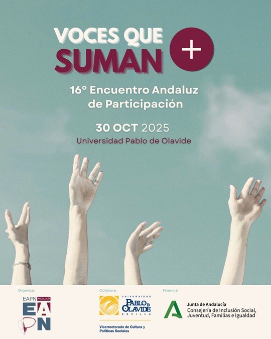 El jueves 30 de octubre la Universidad Pablo de Olavide acoge el 16ª Encuentro Andaluz de Participación 'Voces que suman' que se celebrará de 10:00 a 14:00 horas en la sala de grados del edificio 7 de la UPO. El encuentro está organizado por EAPN Andalucía con la colaboración del Vicerrectorado de Cultura y Políticas Sociales de la Olavide.