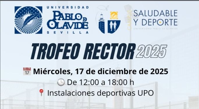 El miércoles 17 de diciembre de 2025, de 12 a 18 horas, en las instalaciones deportivas de la Universidad Pablo de Olavide se celebrará el Trofeo Rector: Pádel 2025 organizado por el Vicerrectorado de Campus Saludable y Deporte a través del Servicio de Deporte de la UPO.