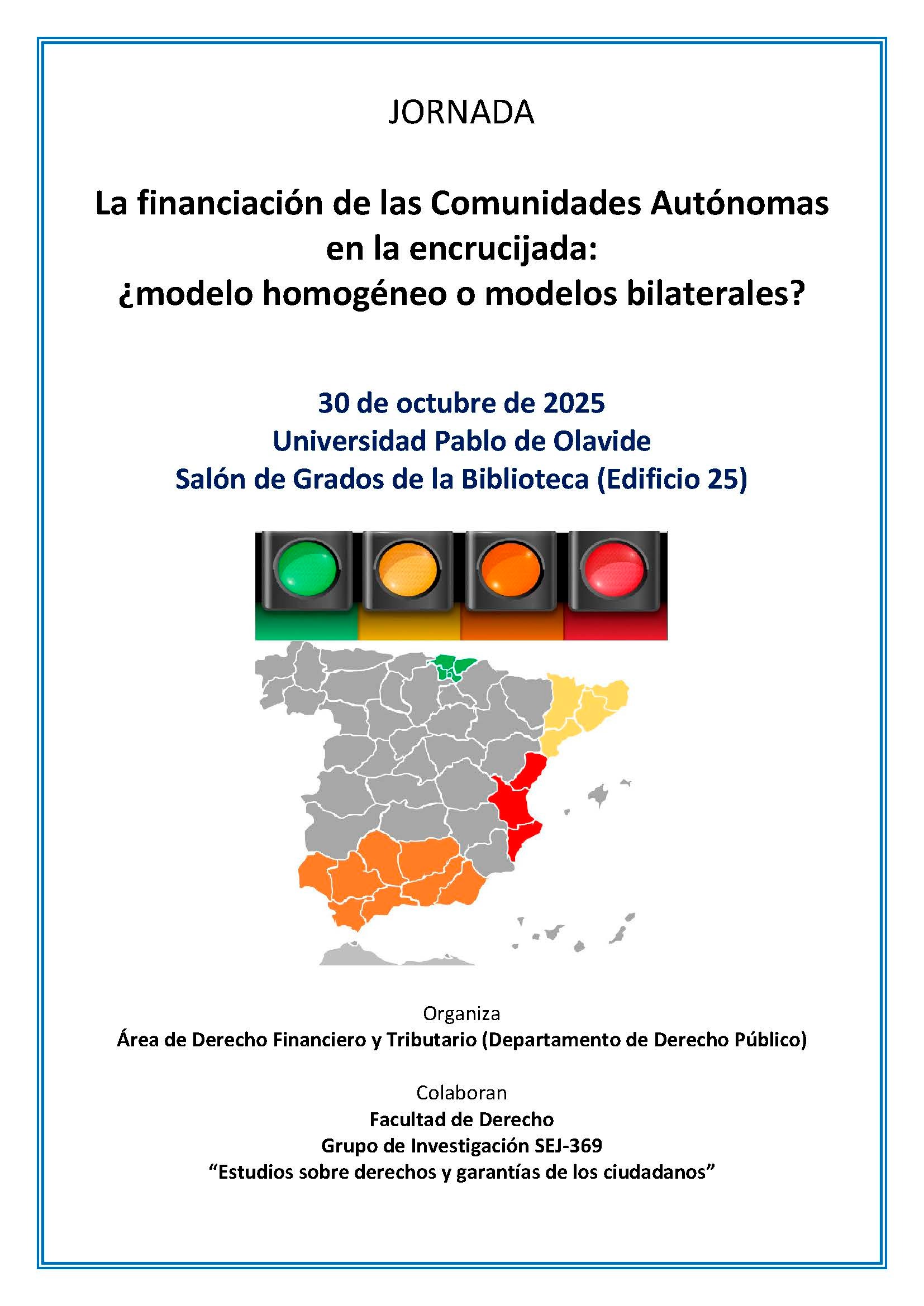 • El jueves 30 de octubre, de 17 a 20 horas, en el salón de grados de la Biblioteca-CRAI de la Universidad Pablo de Olavide, se celebrará la Jornada 'La financiación de las Comunidades Autónomas en la encrucijada: ¿modelo homogéneo o modelos bilaterales?', organizado por el Área de Derecho Financiero y Tributario del Departamento de Derecho Público de la UPO con la colaboración de la Facultad de Derecho y el Grupo de Investigación SEJ-369 'Estudios sobre derechos y garantías de los ciudadanos'.