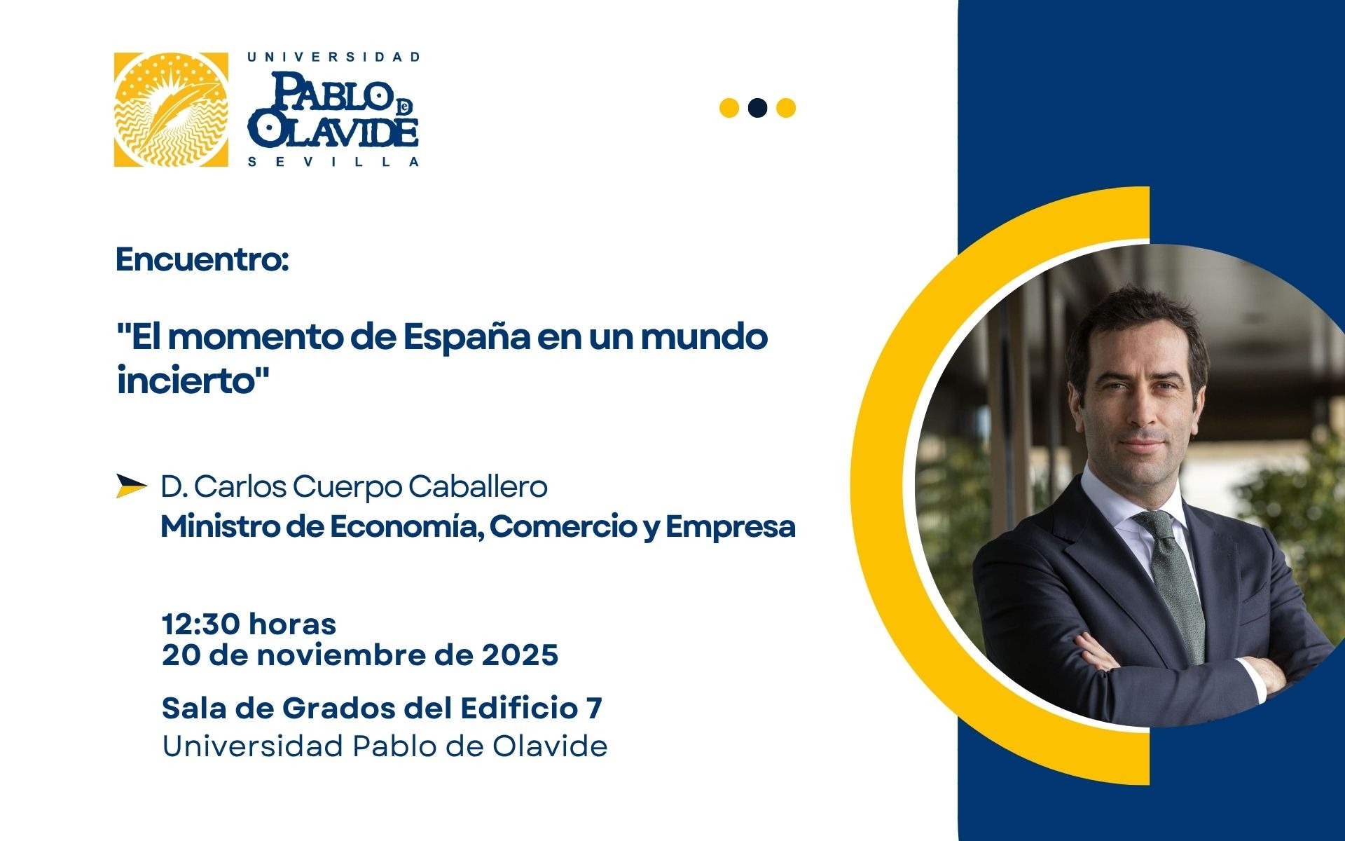 El jueves 20 de noviembre, a las 12:30 horas, en la sala de grados del edificio 7 de la Universidad Pablo de Olavide se celebrará un encuentro con el ministro de Economía, Comercio y Empresa, Carlos Cuerpo Caballero, que hablará sobre 'El momento de España en un mundo incierto'.