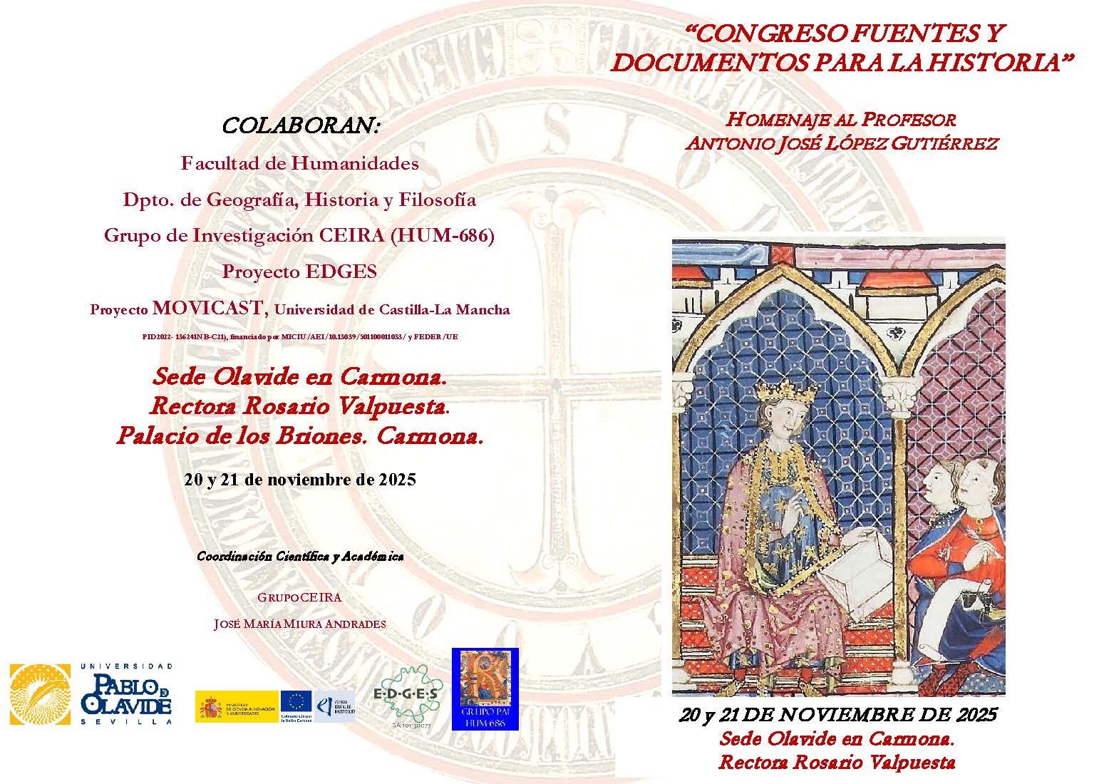 • Los días 20 y 21 de noviembre se celebrará en la Sede Olavide en Carmona (Palacio de los Briones) el Congreso 'Fuentes y Documentos para la Historia' organizado por el profesor de la UPO José Mª Miura Andrades.