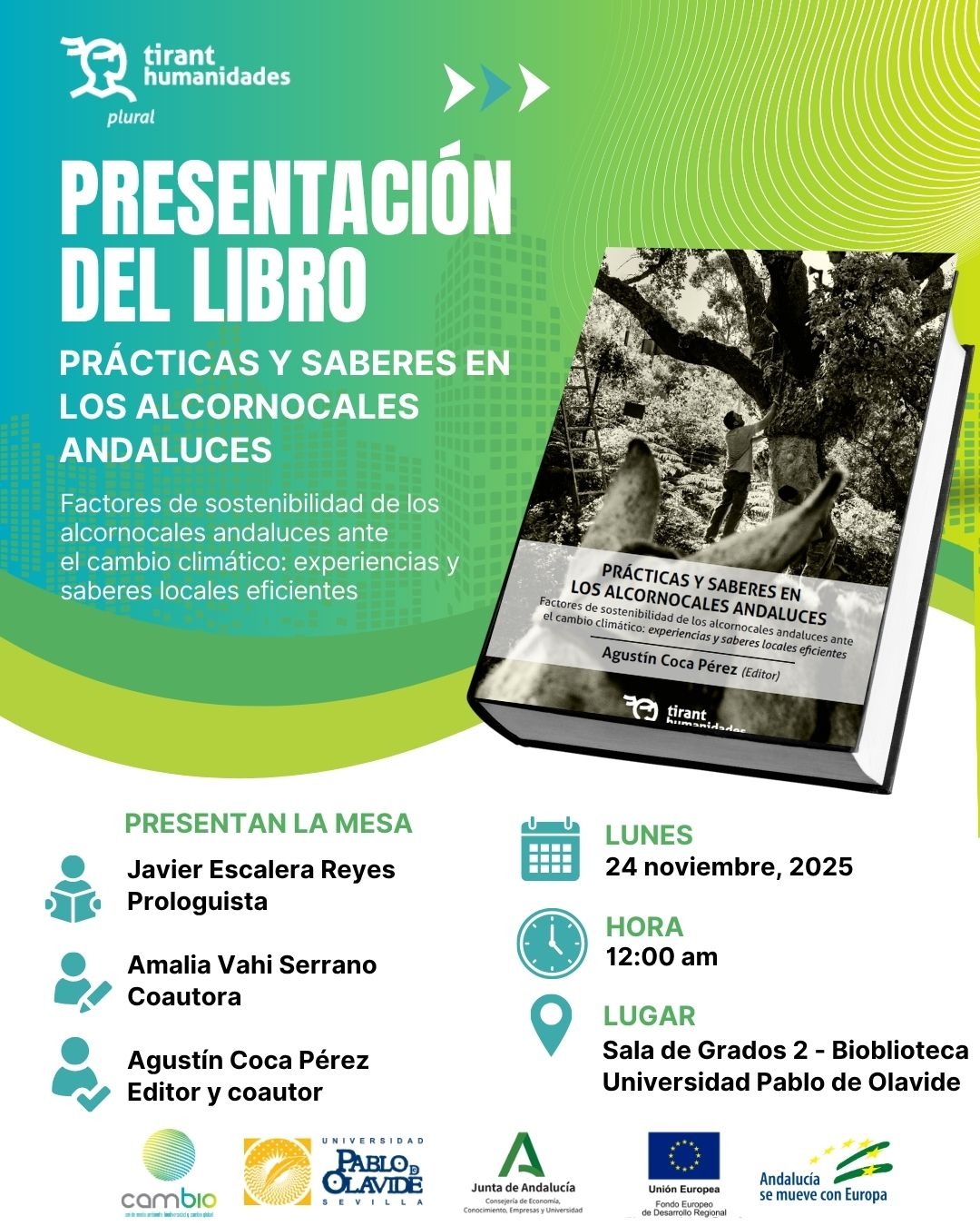 El lunes 24 de noviembre, a las 12 horas, en la sala de grados 2 de la Biblioteca/CRAI de la Universidad Pablo de Olavide, se celebrará la presentación del libro 'Prácticas y saberes de los alcornocales andaluces' de los profesores de la UPO, Agustín Coca Pérez del Área de Antropología Social, y Amalia Vahi Serrano del Área de Geografía Humana.
