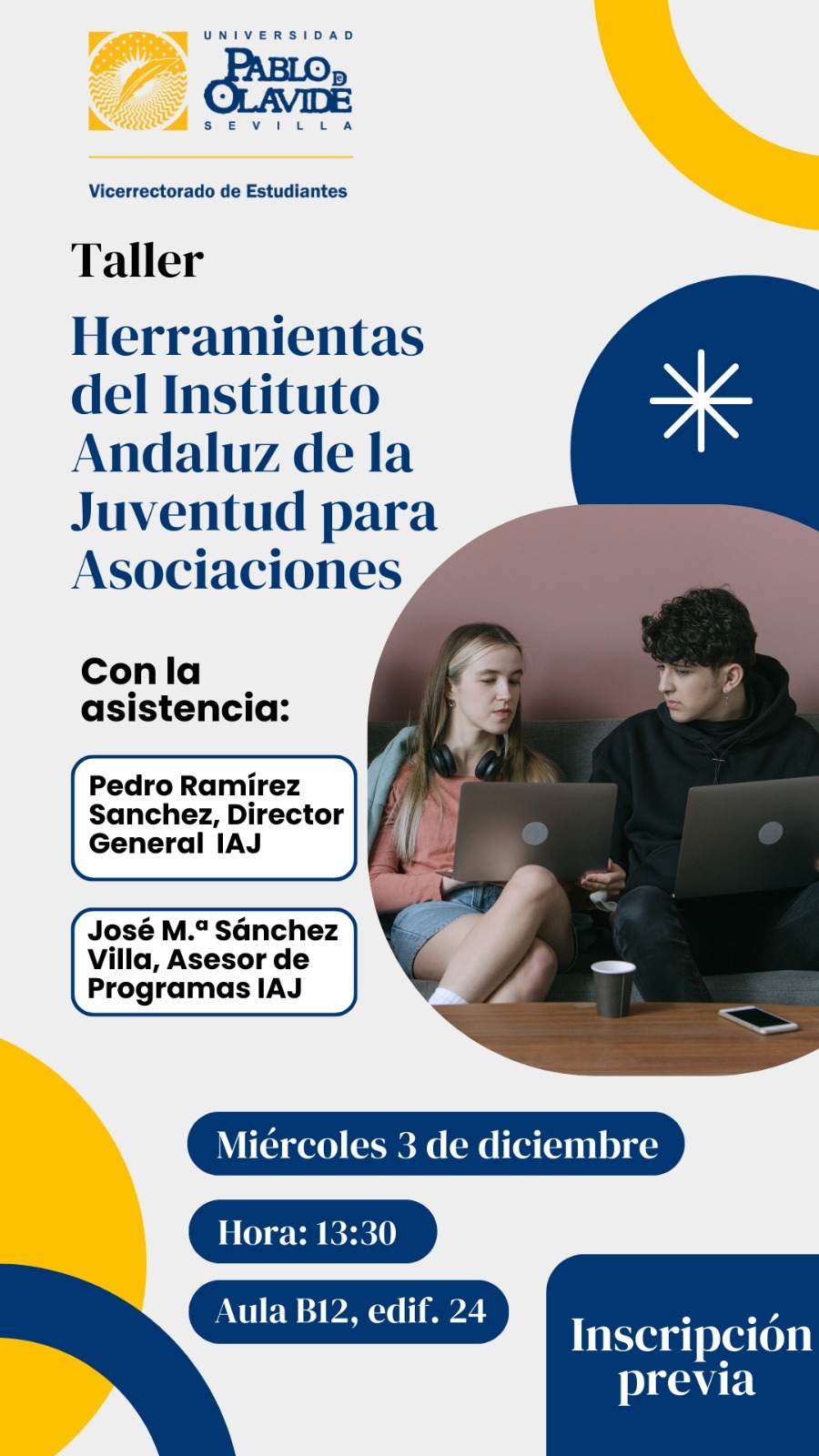 • El miércoles 3 de diciembre, a las 13:30 horas en el aula B12 del edificio 24 de la Universidad Pablo de Olavide, se celebrará el taller 'Herramientas del Instituto Andaluz de la Juventud para Asociaciones' con la participación del director general del IAJ, Pedro Ramírez Sánchez, y el asesor de Programas IAJ, José  Mª Sánchez Villa.