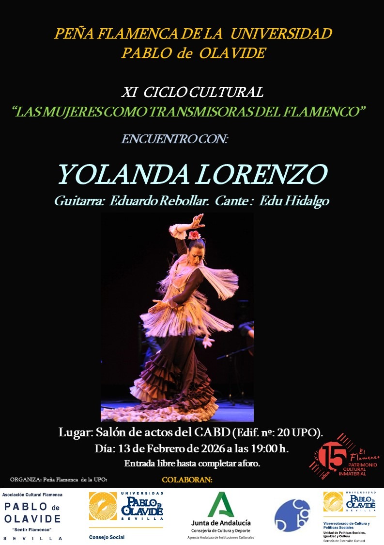 Organizado por la Asociación Cultural ‘Sentir Flamenco’ de la UPO, el ciclo reivindica a través de actuaciones y encuentros con artistas, el papel de las mujeres en la historia y en la actualidad del arte flamenco. El Ciclo cuenta con el apoyo del Instituto Andaluz del Flamenco, del Vicerrectorado de Cultura y Políticas Sociales, a través del Servicio de Extensión Cultural, y del Consejo Social de la Universidad Pablo de Olavide, que recientemente se ha sumado al impulso de una actividad que lleva ya una década celebrándose en el campus UPO.