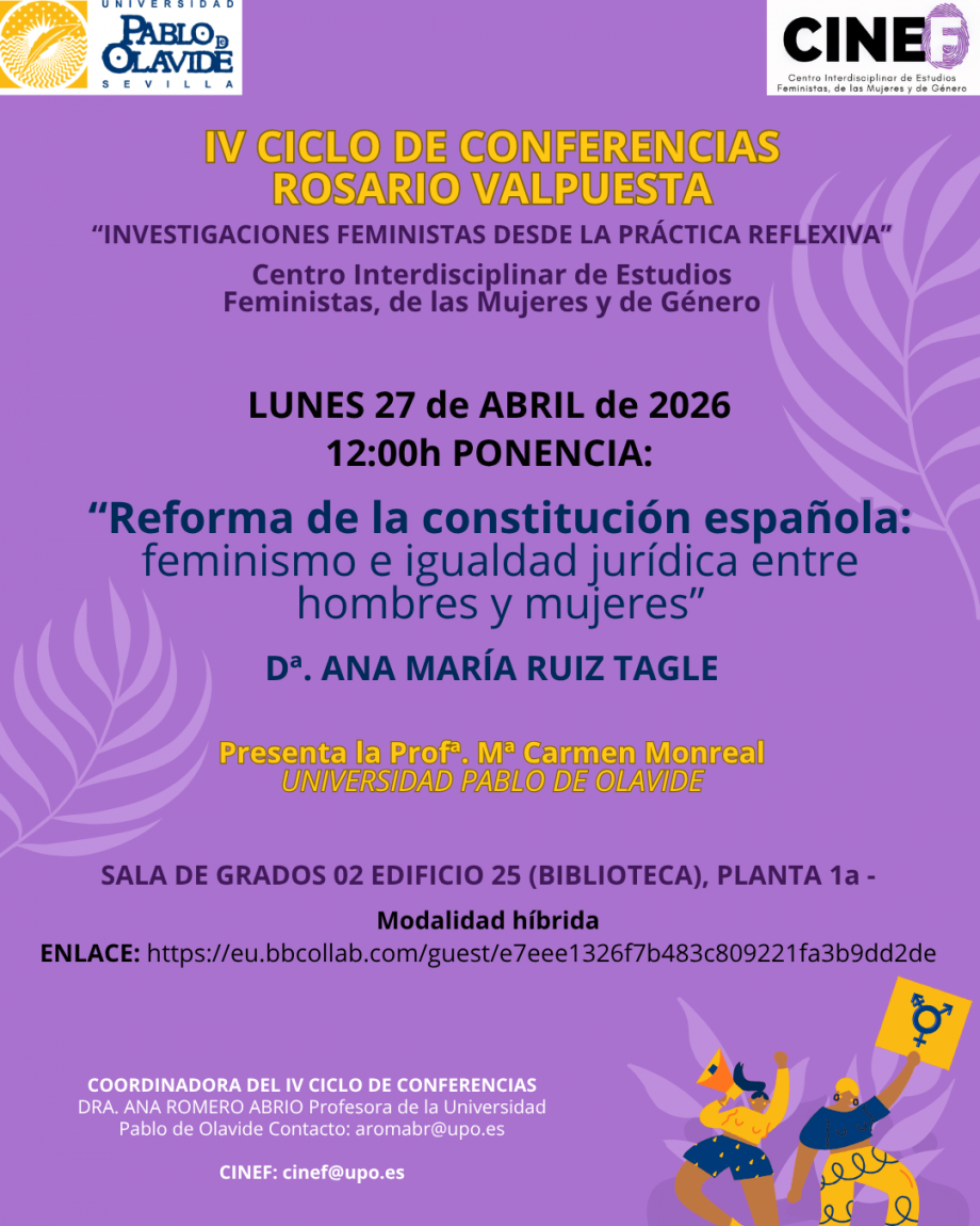 • La 4ª edición del Ciclo de Conferencias Rosario Valpuesta 'Investigaciones feministas desde la práctica reflexiva' continúa el lunes 27 de abril a las 12 horas en la Sala de Grados 2 de la Biblioteca/CRAI de la Universidad Pablo de Olavide, con la conferencia 'Reforma de la constitución española: feminismo e igualdad jurídica entre hombres y mujeres', a cargo de la abogada Ana María Ruiz Tagle.